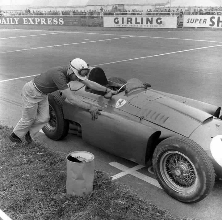 1956 Britanya GP, Ferrari sürücüsü Fangio'nun 1. diğer Ferrari sürücü Peter Collins'in 2. olduğu yarışta 10. sıradaki diğer Ferrari sürücüsü Alfonso de Portago 9 tur fark yemiş ve finishe getirmek için arızalanan Ferrari'yi itiyor.