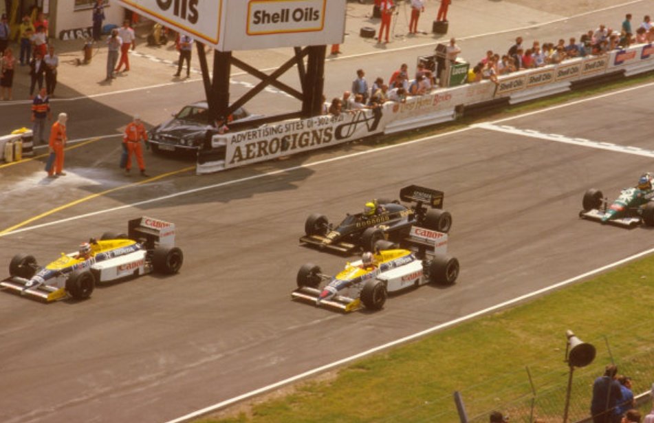 İlk sırada Nelson Piquet hemen ardında Nigel Mansell ve onun arkasında da Lotus 98 ile Ayrton Senna var. Fotoğrafın sonunda ise Gerhard Berger görülüyor.