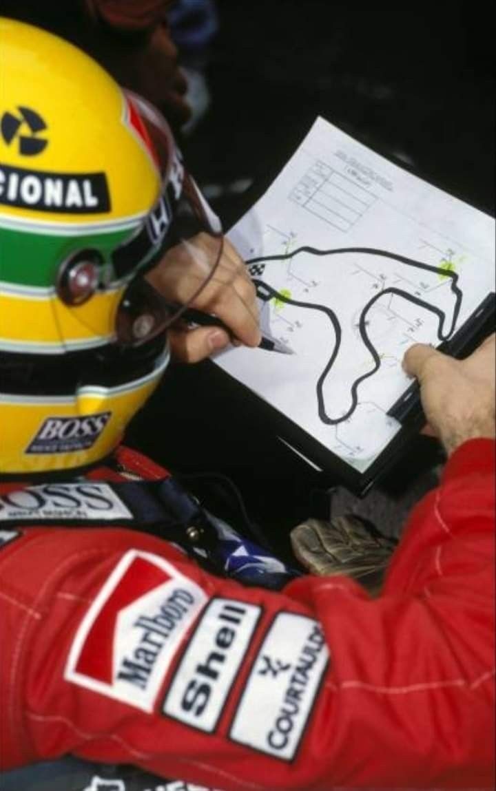 Ayrton Senna, aracında Spa Francorchamps'ın pist çizimine bakıp. Notlar alıyor.