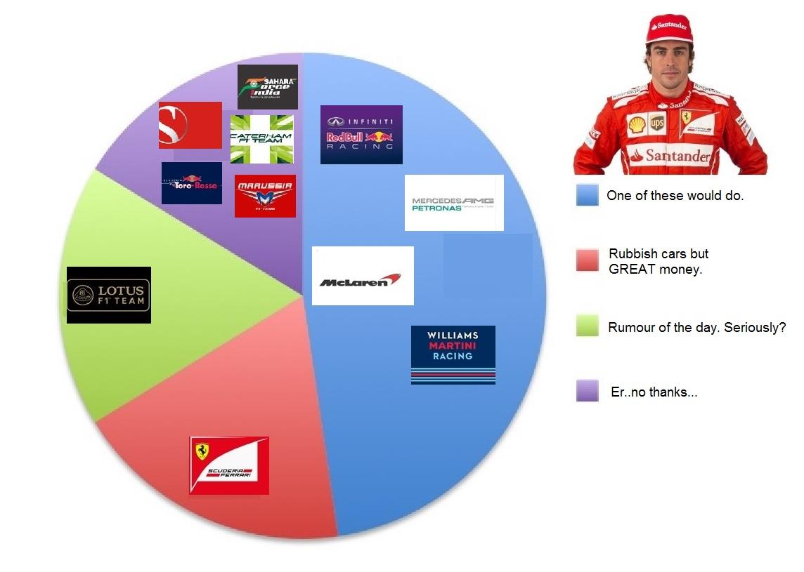 Alonso'nun transfer gündemi -- Mavi: Bunlardan birisi olabilir, Kırmızı: Çöp araba-ama iyi para, Yeşil: Günün söylentisi, Mor: Almayayım, kalsın!