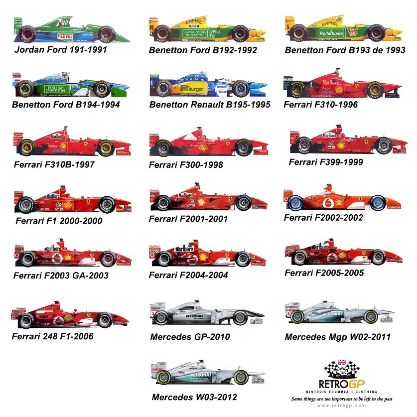 Schumi'nin yarıştığı tüm otomobiller! Schum'inin 1991'de beş yarışa katıldığı Benetton B191'i ve 92'de ilk üç yarışa katıldığı B191B'yi koymamışlar...