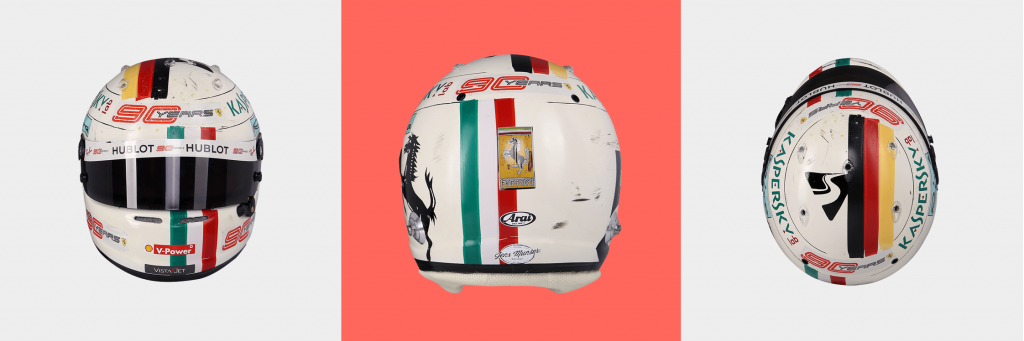 Tıpkı Monako gibi özel kask tasarımlarının bir başka adresi Monza’dır. Ferrari sürücüleri başta olmak üzere özel kask tasarımlarına ev sahipliği yapan Monza sporun bir başka ikonik pistidir. Uzun düzlükleri ve hızlı virajlarıyla “hız tapınağı” olarak anılan Ferrari’nin evi tarihin en hızlı turlarına sahne oldu. Tarihin en hızlı turu 1:18.887 ile şu an Lewis Hamilton’ın cebinde. Siyah W11’i ile attığı bu turdan önce en hızlı turu Kimi Raikkönen elinde tutuyordu. 1:19.119’luk turunu 2018 yılında Serhan Acar’ın eşsiz anlatımıyla izlemiştik. Brezilya yarışları Hamilton için ayrı bir önemi olduğu gibi Monza yarışları da Vettel için ayrı önemlidir. Hayranı olduğu ve kahramanın efsaneleştiği takımın evi olan İtalya pistinde Seb’in özel anları var. Bu anlardan biri ilk pole’ü ve galibiyetiydi. Yazının ilerleyen kısmında bu yarışa da yer vereceğiz ancak Seb’in Ferrari döneminde Monza’da taktığı kaskların hepsi ayrı ihtişamlıydı.