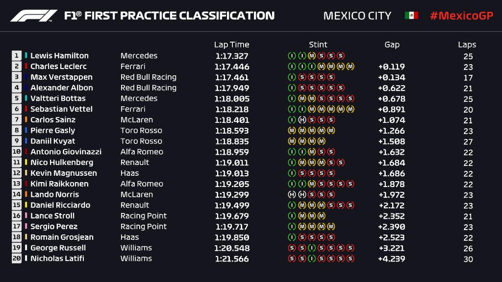 2019 Formula 1 sezonunun 18. yarışı olan Meksika GP öncesi gerçekleştirilen ilk antrenman seansında Mercedes pilotu Lewis Hamilton en hızlı isim olmayı başardı.