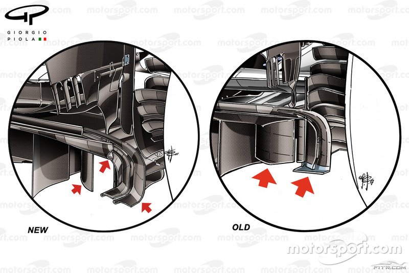 Ön kanattaki değişiklikler, ön fren kanalında değişikliği beraberinde getirdi. Lastik duvarının gerisinde kalan hava girişi genişletilerek bu iki bölümdeki aerodinamik etkileşim değiştirilmiş oldu.