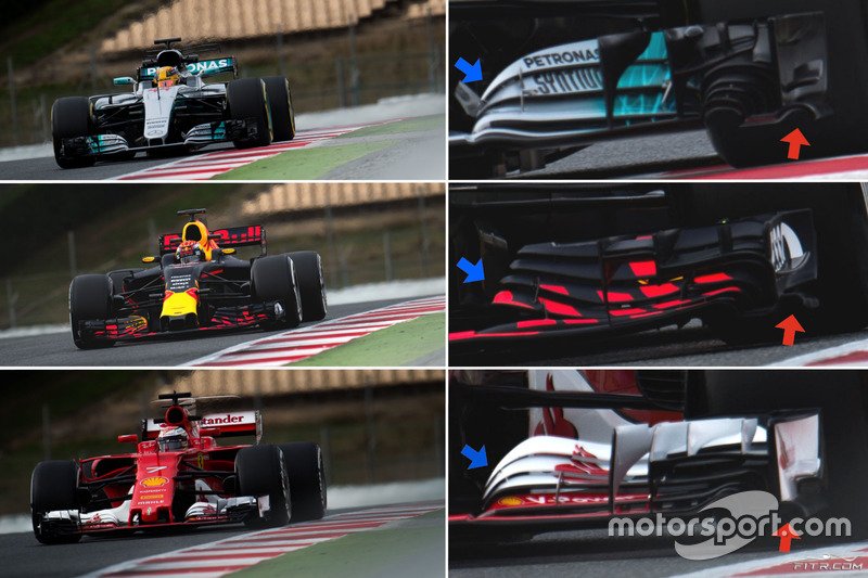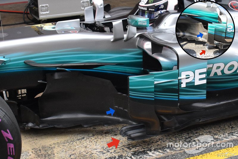 Tabanın ön ucunda hava akımıyla çalışmak için Mercedes'in kullandığı tasarım, Red Bull ve Ferrari ikilisi tarafından izlenmemiş.