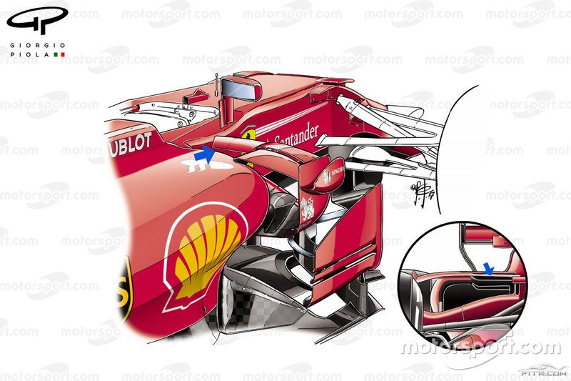 Ferrari ise bu bölgede kendi tasarım felsefesini izlemeyi sürdürüyor. Karmaşık yüzgeç kanatçıklar ve dış bölüm (okla gösterilmiş) kullanan İtalyan ekip, testler boyunca buraya ufak dokunuşlar yaptı.