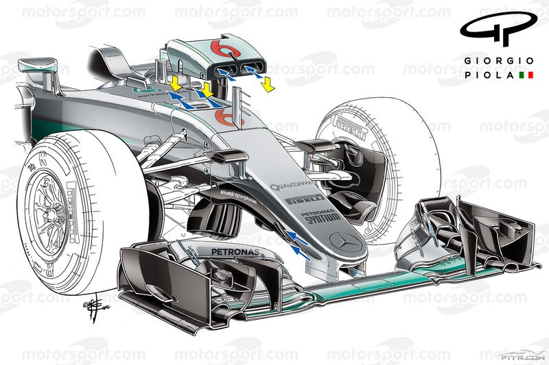 Mercedes'in burunda gittiği çözüm bir önceki sezon kullanılana oldukça benziyor (yukarıdaki resim). Hava akımını burun-şasi bağlantısının hemen altından biraz daha çıkıntılı bir yerden içeriye yönlendiren ekip, bu durumun getirdiği paketleme sorunlarını gizleme paneliyle aşmış.