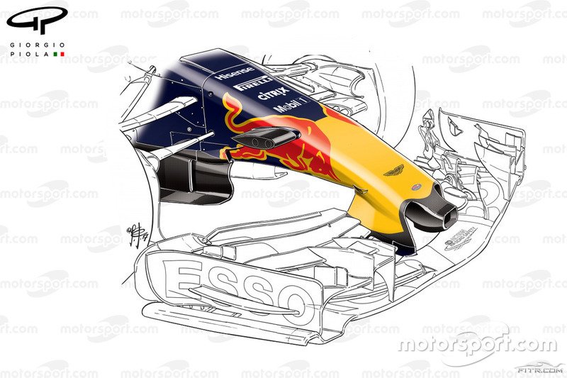 Öte yandan Red Bull, yönlendirme kanatçıklarının arkasına bir tane daha dikey kanatçık ekleyerek bargeboard'lara kadar uzanan ve tüneli andıran bir yapı yakalamış.