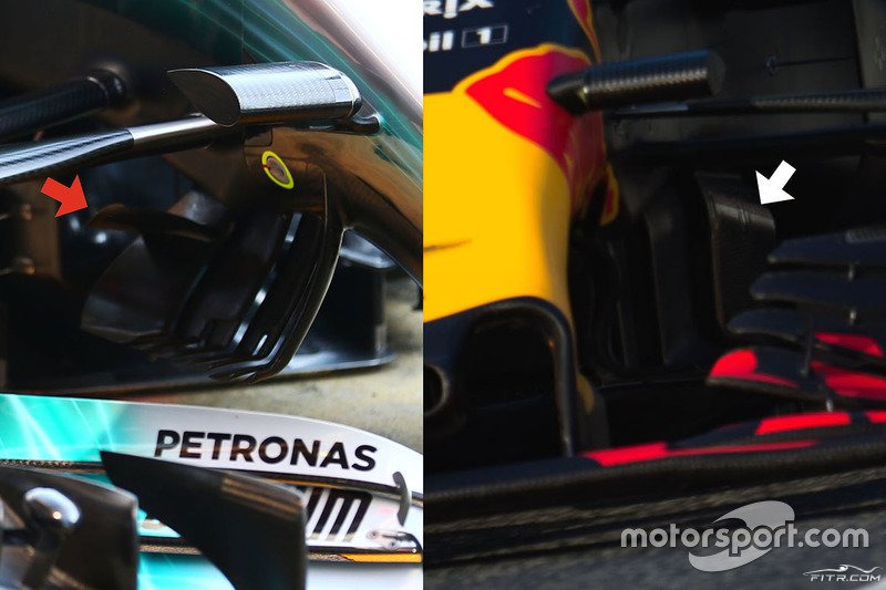 Burun-şasi birleşiminin altında, Mercedes ve Red Bull'un farklılıklarının pik yaptığı bir başka alan var. Mercedes, bu alanda aerodinamik felsefesini yansıtan çok karmaşık yönlendirme kanatçıkları kullanmış. Kırmızı okla gösterilen yerde yeni ve daha yatay bir kanatçık dikkat çekiyor.