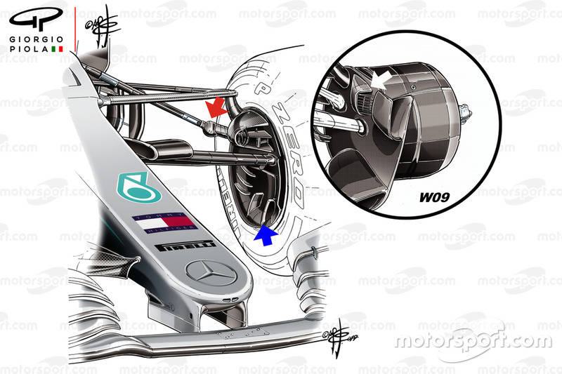 Mercedes, yeni fren kanalı kurallarını daha dış kısma mavi ok ile gösterilen minik kanatçıkları yerleştirerek zorlamaya başladı. Bu kapsamda dış kasnak genel olarak iç bükey şeklinde tasarlandı.