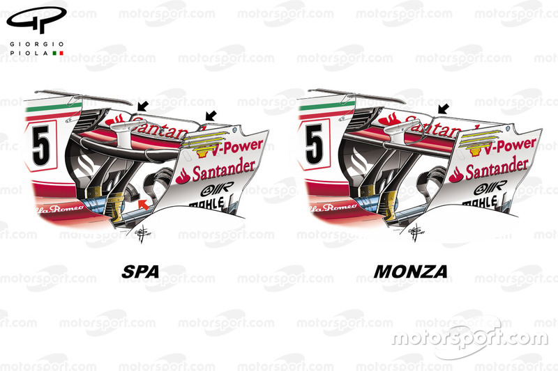 Daha önce çift ayırıcı V yiviyle (siyah oklar) yarışan takım, İtalya'da ana düzlem ve üst kanatçığı aynı hizada bir oyuk ile birleştirmeyi tercih etmiş. Ayrıca ucu açık kanat kenar plakası panjurlarının (sarı ile belirtilmiş) da geleneksel, kapalı uçlu düzenle değiştirildiğini not etmek lazım.
