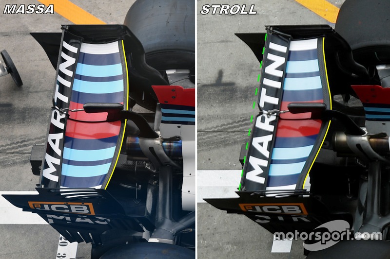 Üst kanatçığın şekli de hatırı sayılır şekilde farklı. Stroll'ün kullandığı kanat, üstteki ve alttaki resimlerdeki yeşil çizgiden göreceğiniz üzere içeri ve aşağı doğru büyük bir eğim yapıyor