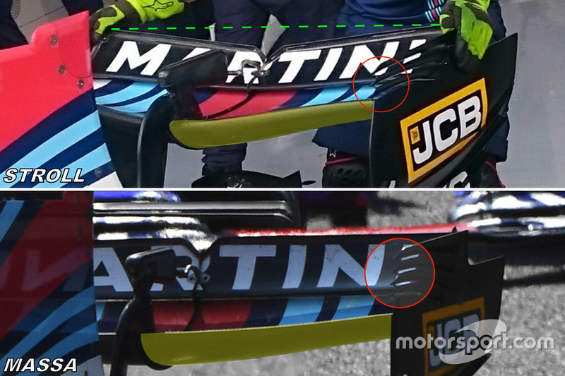 Üst kanatçığın şekli de hatırı sayılır şekilde farklı. Stroll'ün kullandığı kanat, üstteki ve alttaki resimlerdeki yeşil çizgiden göreceğiniz üzere içeri ve aşağı doğru büyük bir eğim yapıyor