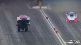 Cruz Pedregon havalı bir şekilde yarış nasıl kazanılır çok iyi biliyor çünkü NHRA Funny Car sürücüsü yarışı iki teker üzerinde bitirerek çok konuşulacak bir zafer kazanıyor. Hatta öyle bir an geldi ki drag yarışçısının havada uçmasını engelleyen tek şey wheelie barıydı. Bu çılgın sürüşe rağmen Pedregon ortalama 351.7 km / sa hıza ulaştı ve bu yalnızca 4.244 saniye aldı.