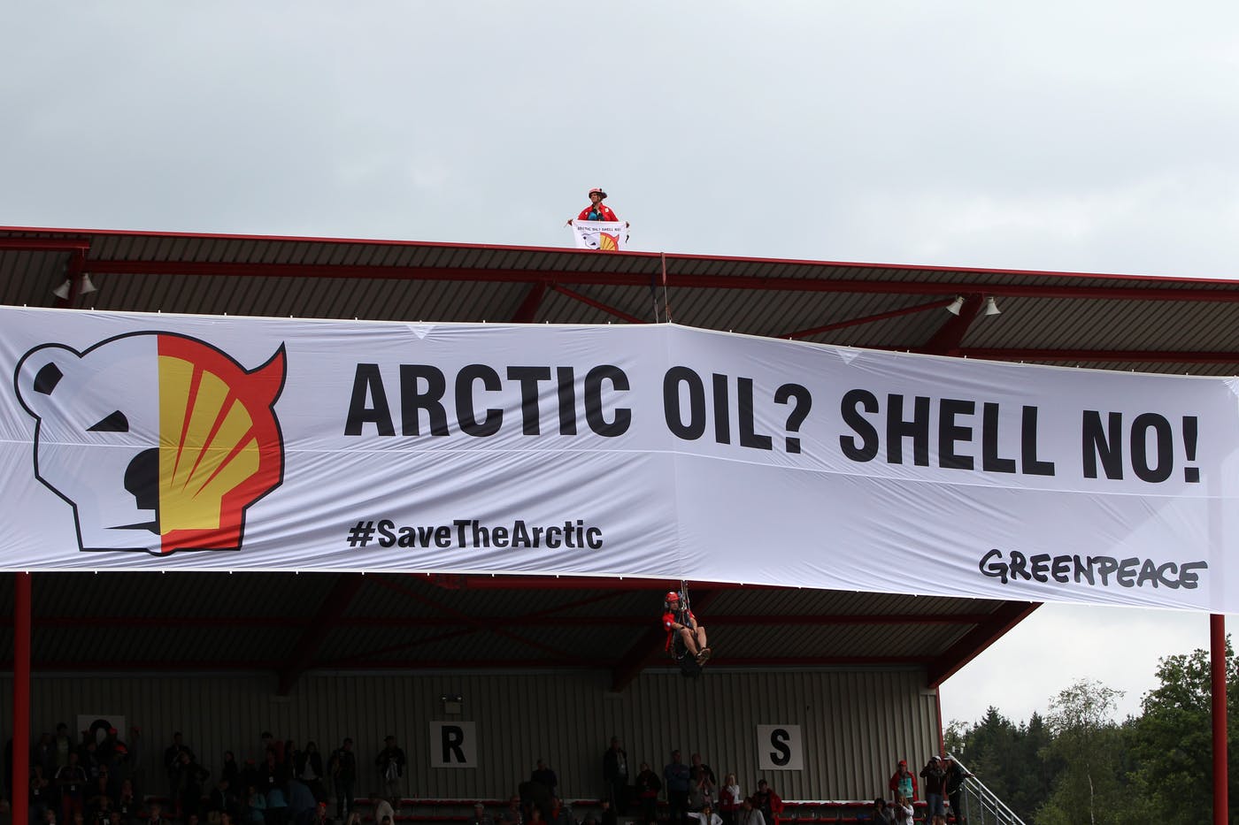 Yarış sponsoru Shell’in kutuplardaki ayılara kibar davranmayacağından endişe eden protestocular, pistin ana tribününe dev bir afiş asmıştı. Ancak FOM kameramanları orayı göstermeyebilirlerdi.