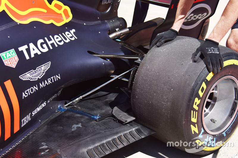 Takımların tabanı lastiğin ön yüzüne oldukça yakın yerleştiriyor. Bu sayede lastik etrafında oluşan istenmeyen hava akımının sirkülasyonu minimuma indirilmiş oluyor. Red Bull, yeni tabanını sürtme olmayacak şekilde lastiğe yaklaştırmayı sürdüren ekiplerden. Hatta bunu en sık yapan takım diyebiliriz.
