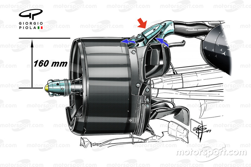 Fren kanalının üst köşesine yerleştirilen parçayla oluşturulan hava girişi, verilen 160 mm ölçünün üstünde yer alıyor. Bu yüzden FIA, bu çözümü kullanan takımların değişiklik yapmak zorunda kalacaklarını doğruladı.