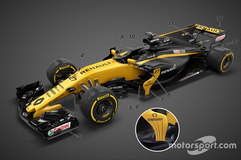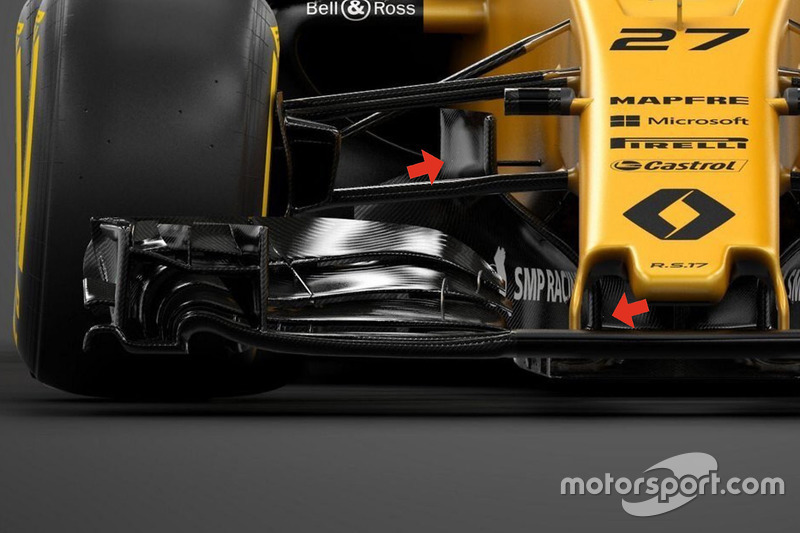 RS17'de dikkat çekici parçalardan birisi, sidepod kenarlarında yer alan kanatların aşağıya doğru indikçe ileriye doğru kıvrılması ve bu şekilde tabanla birleşmesiydi (6).