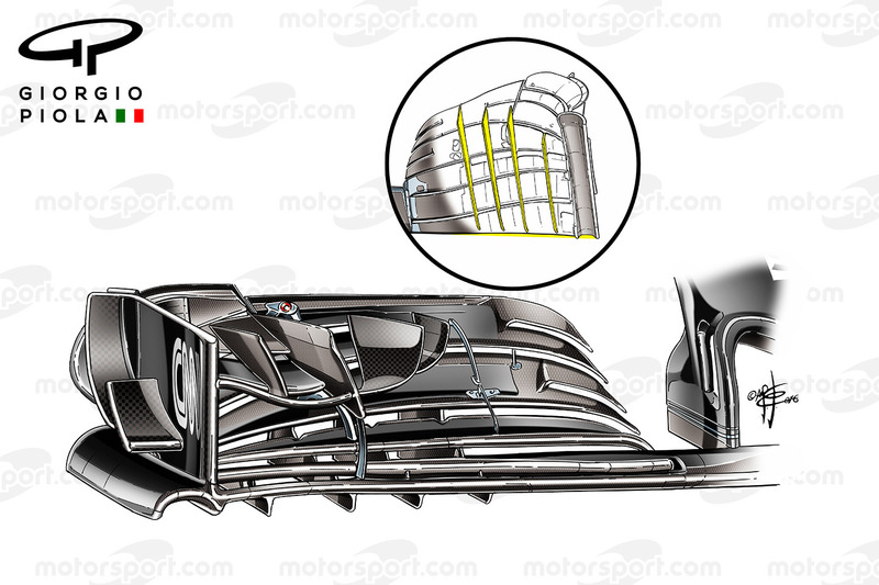 Dış bölümde bir tünel oluşturarak hava akımını ön lastiğin etrafından sert bir şekilde döndürmeyi amaçlayan ön kanadın orta bölümü, 2016 sonlarında McLaren'den görmeye (yukarıda) alıştığımız gibi düz bir zemine sahip.