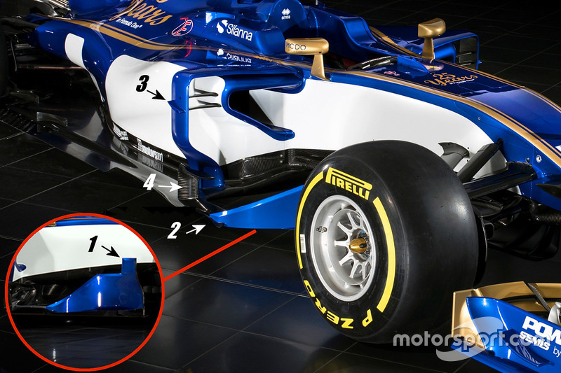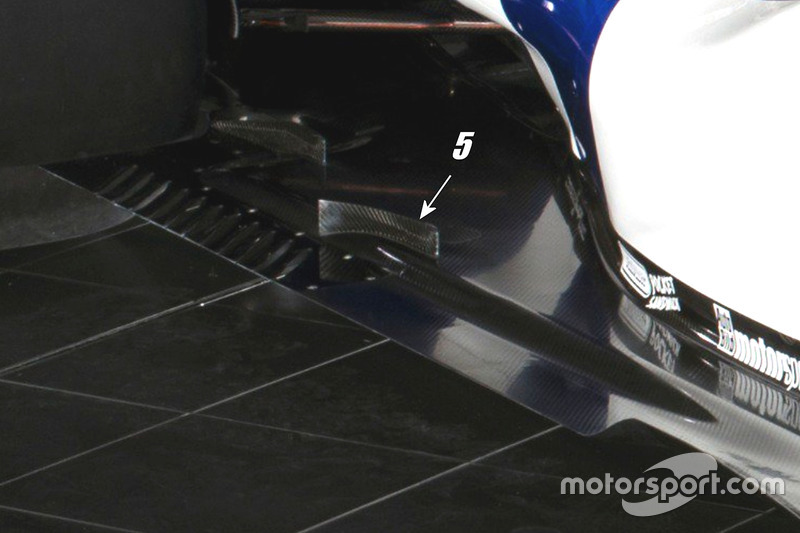 Sidepod'un yan bölümündeki kolonun ortasında ise, hava akımını düzenleyecek küçük bir kanatçık [3] görüyoruz. Tabanın ucundaki 'r' kanatçığı da [4] benzer bir görevi üstleniyor.