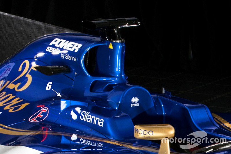 Kokpitin arka bölümündeki dışa eğimli dikey kanatçık [6] ise, sidepod üzerindeki hava akımını düzenlemeyi hedefliyor. Benzer bir parçayı geçen yıl Manor'da görmüştük.