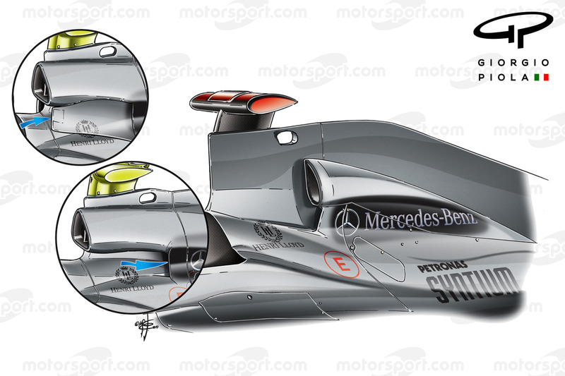 2011 öncesi kural değişiklikleri, Mercedes'inki kadar ince roll-bar kullanmayı yasaklasa da, Team Lotus ve Force India, kurallara uygun bir şekilde bu tasarımı yeniden kullanmıştı.