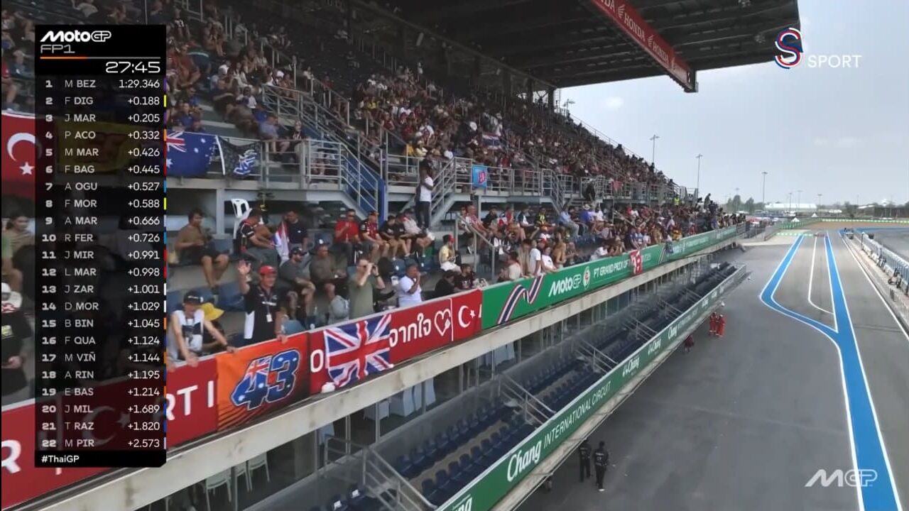 Toprak Razgatlıoğlu ile birlikte tribünlerde birçok Türk bayrağı ekranlara geldi. Razgatlıoğlu, antrenmanlardaki ilk turuna Marc Marquez’in önünde çıktı.
