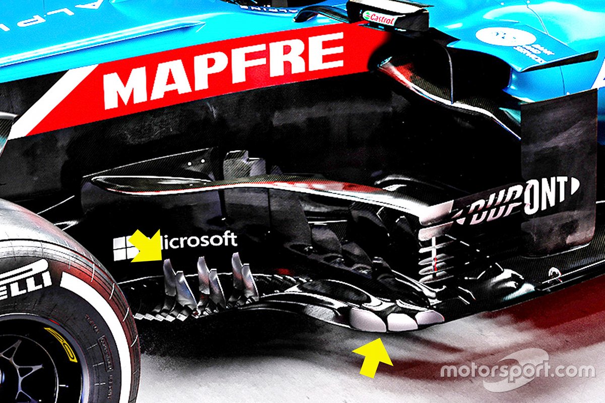 Mercedes motorlu takımlarda genelde ikinci tasarım yer alıyor. Alpine'de ise altı kesik bir şekilde geriye doğru kıvrılan tasarım bulunuyor.