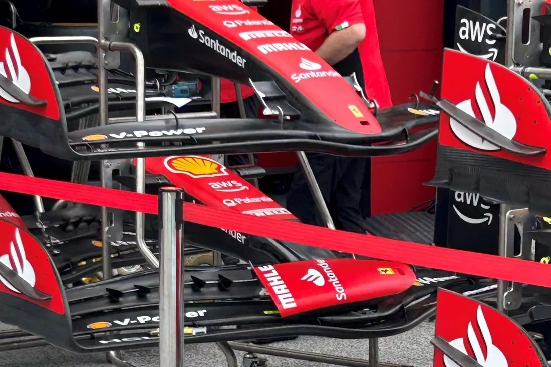Ferrari ön kanadının üst iki elemanı takılı olmadan harika bir görünümü. Bu, bazı yeni parçaların yolda olduğu manasına geliyor olabilir.