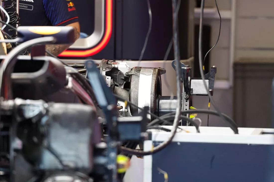 Red Bull RB19'un ön fren tertibatının kapaklarının altına bakıldığında, sıcaklıkları düzenlemeye yardımcı olmak amacıyla hem kaliperi hem de diski çevrelemek için kullanılan boru tesisatı görülüyor.