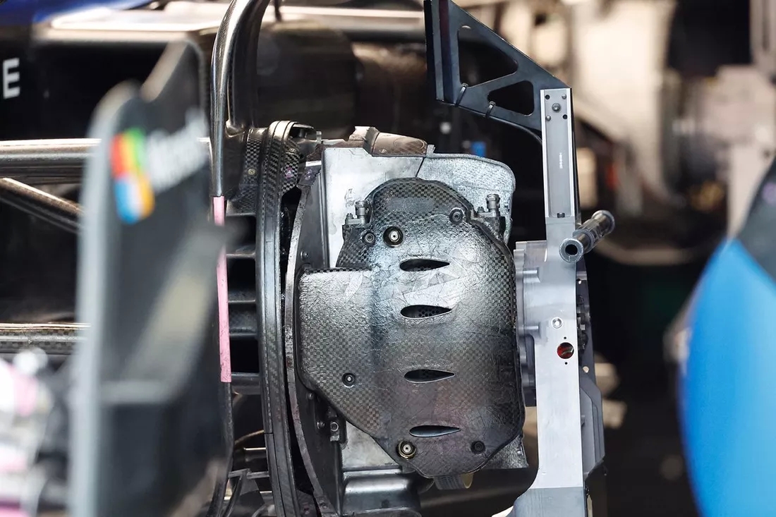 Williams FW45'in disk kaplaması, sadece diski değil aynı zamanda kaliper gibi çevresindeki bileşenleri de barındıracak şekilde tasarlanmış.