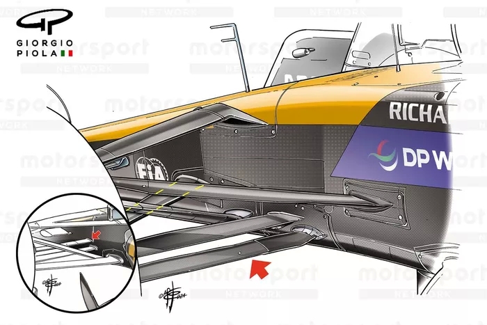 Bu değişiklik şüphesiz daha fazla dalış önleme eğilimi sağlamaya yardımcı olacaktır. Ancak aynı zamanda karoserin arkasındaki zemine ve sidepoda doğru ilerlerken hava akışı için farklı bir geçiş sağlar.