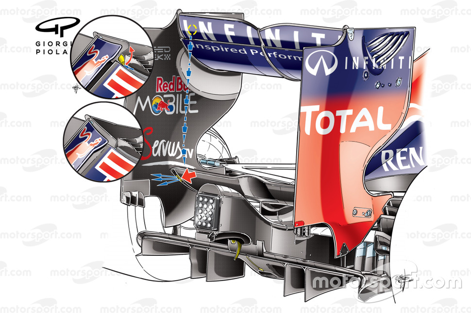 Peki bu sistem tam manasıyla boşa bir çalışma mıydı? Hayır. Aşağıdaki çizimde Red Bull'un kendi çift DRS'sini farklı bir şekilde geliştirdiğini görebilirsiniz.