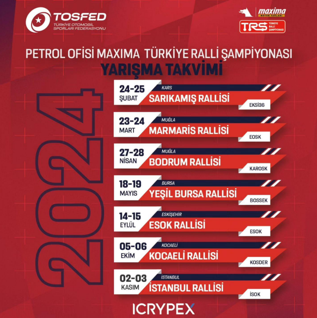 2024 Petrol Ofisi Maxima Türkiye Ralli Şampiyonası takvimi, 6 farklı şehirde toplam 7 yarış içeriyor. Sezon Şubat ayında Kars’ta Sarıkamış Rallisi ile başlayıp Kasım ayında İstanbul’da sona erecek.