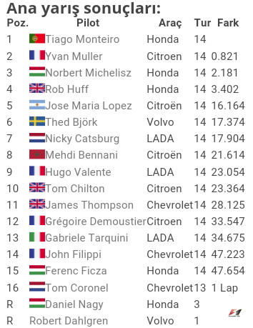 Bu galibiyetle birlikte 2016’daki ikinci zaferini elde eden Tiago Monteiro, şampiyonada da ikinci sıraya yükseldi. Ancak lider Lopez ile arasındaki puan farkı 101, bu da dört yarış galibiyetinden bir puan daha fazla.